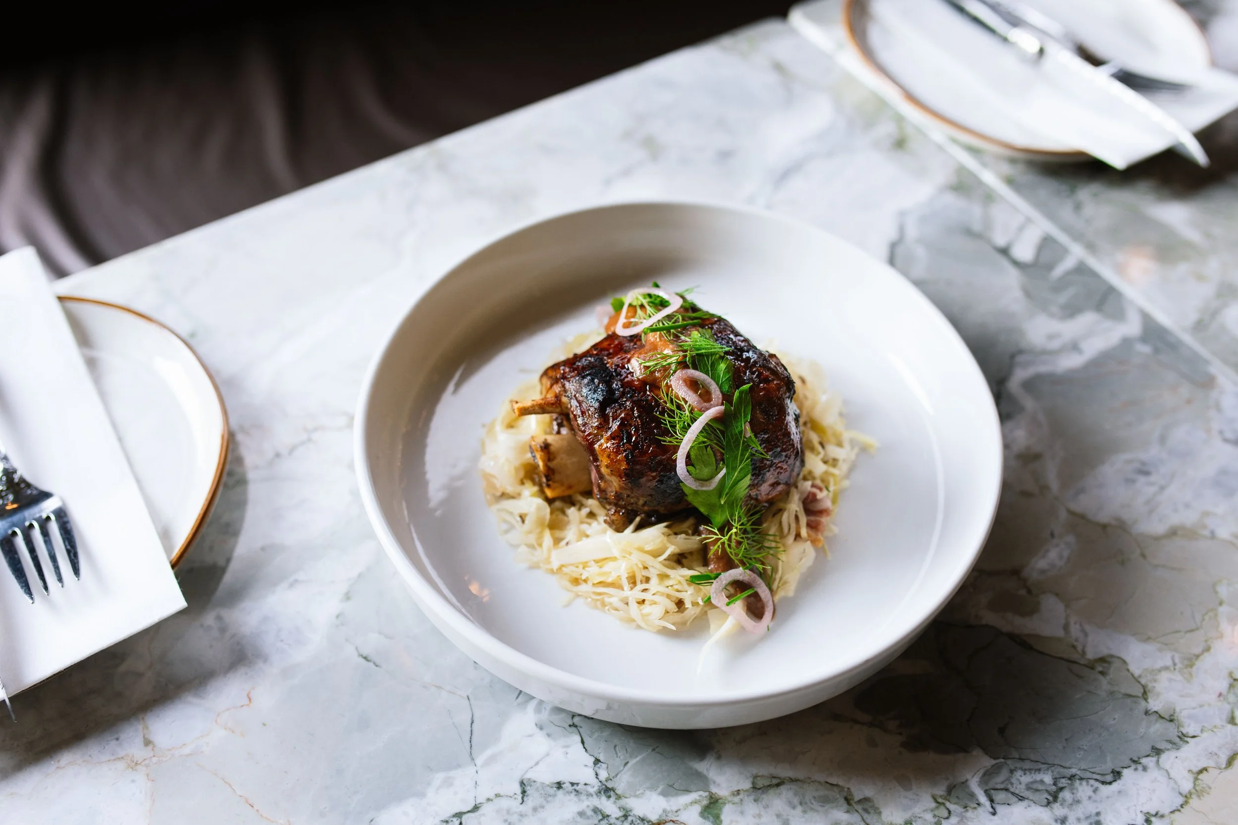 Sauerbraten is the most classic of the entrees. Boneless beef short rib is braised in red wine spiked with juniper berry, then served over polenta. The dish is finished with a beefy sauce, crème fraiche, dill, and quince vinegar.