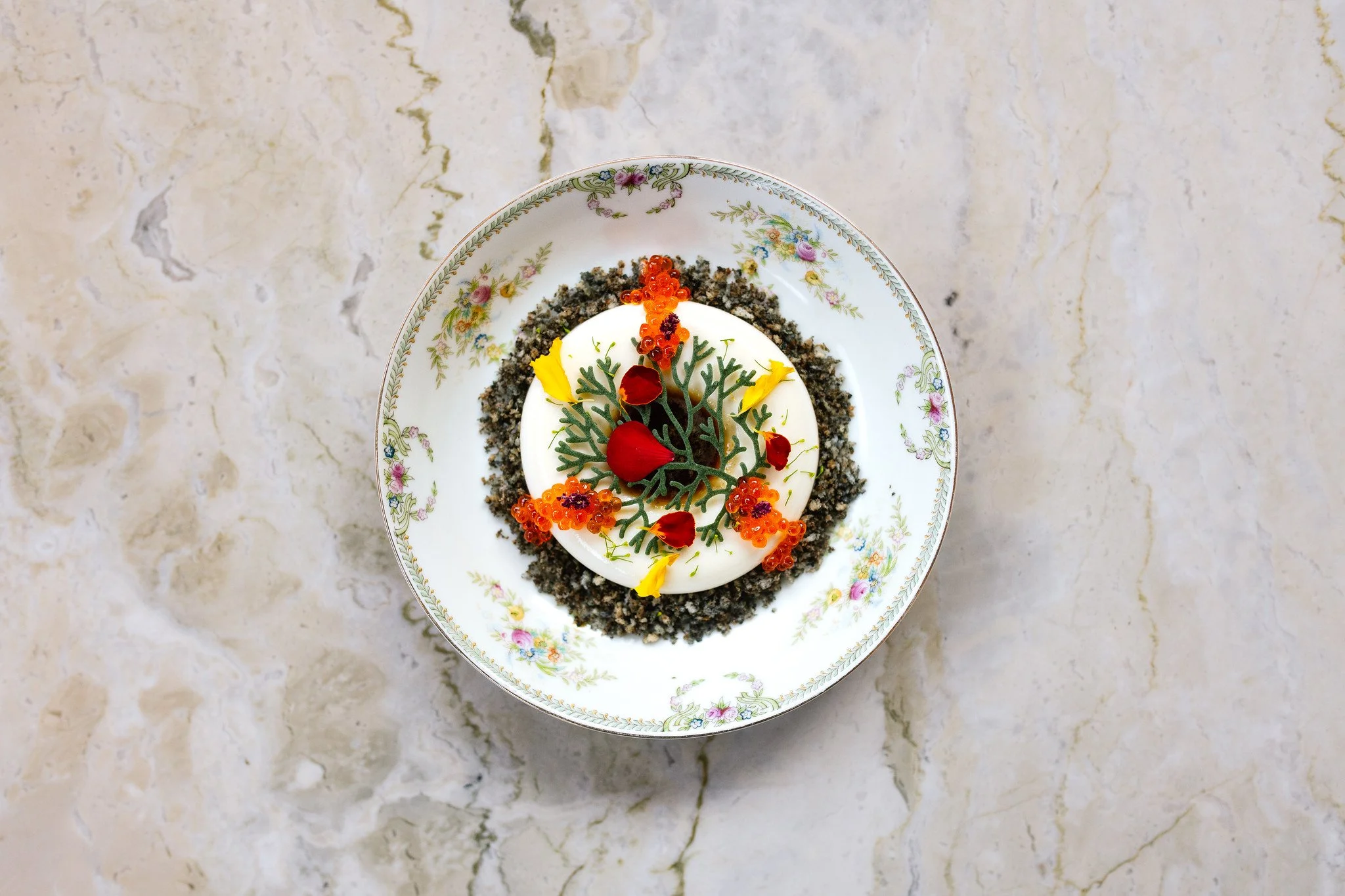Of the starters, my favorite has easily been the Mousse. In another time, I’d think this plate came from Sidney Street Café or Niche. The mousse itself is made with Alp Blossom cheese, similar to a Gruyère, but its rind is made from edible flowers, like marigolds, cornflowers, rose, and so on, giving it an extra floral note. It’s surrounded by a charcoal and black truffle crumble, and its center is filled with a vermouth gel. To finish, it’s topped with an algae tuile, smoked trout roe, and flowers.