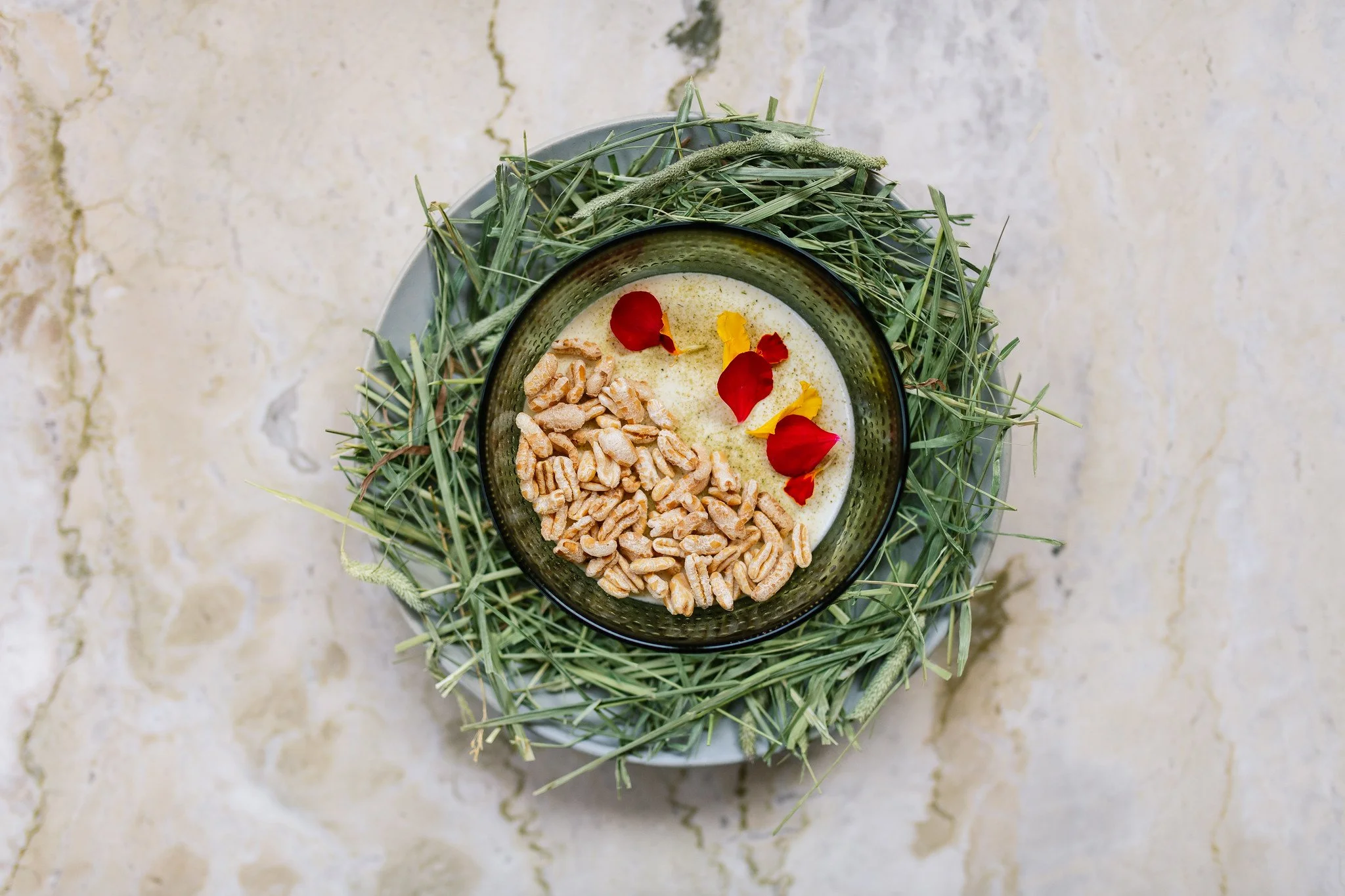 I’ve only made it to dessert once, and it was just as unfamiliar and intriguing as the rest: a panna cotta made with smoked hay and spruce tips, topped with puffed wheat, candied herbal flowers, fresh flowers, and spruce powder.